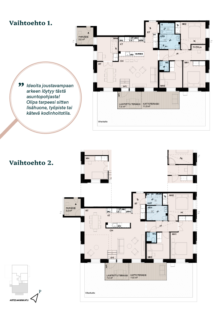 Tässä neljän tai viiden huoneen kodissa yhdistyvät avaruus ja toiminnallisuus. Kolme tai neljä makuuhuonetta ja erillinen työtila tarjoavat joustavuutta, joka sopii niin lapsiperheelle kuin etätyötä arvostavalle. Avoin olohuone-keittiö on kodin sydän, jossa on tilaa yhteisille hetkille. Saunallinen kylpyhuone ja erillinen WC helpottavat arkea, ja lasitettu terassi sekä kattoterassi tuovat luksusta ympäri vuoden. Saunan tilalle voit valita myös kodinhoitotilan.
