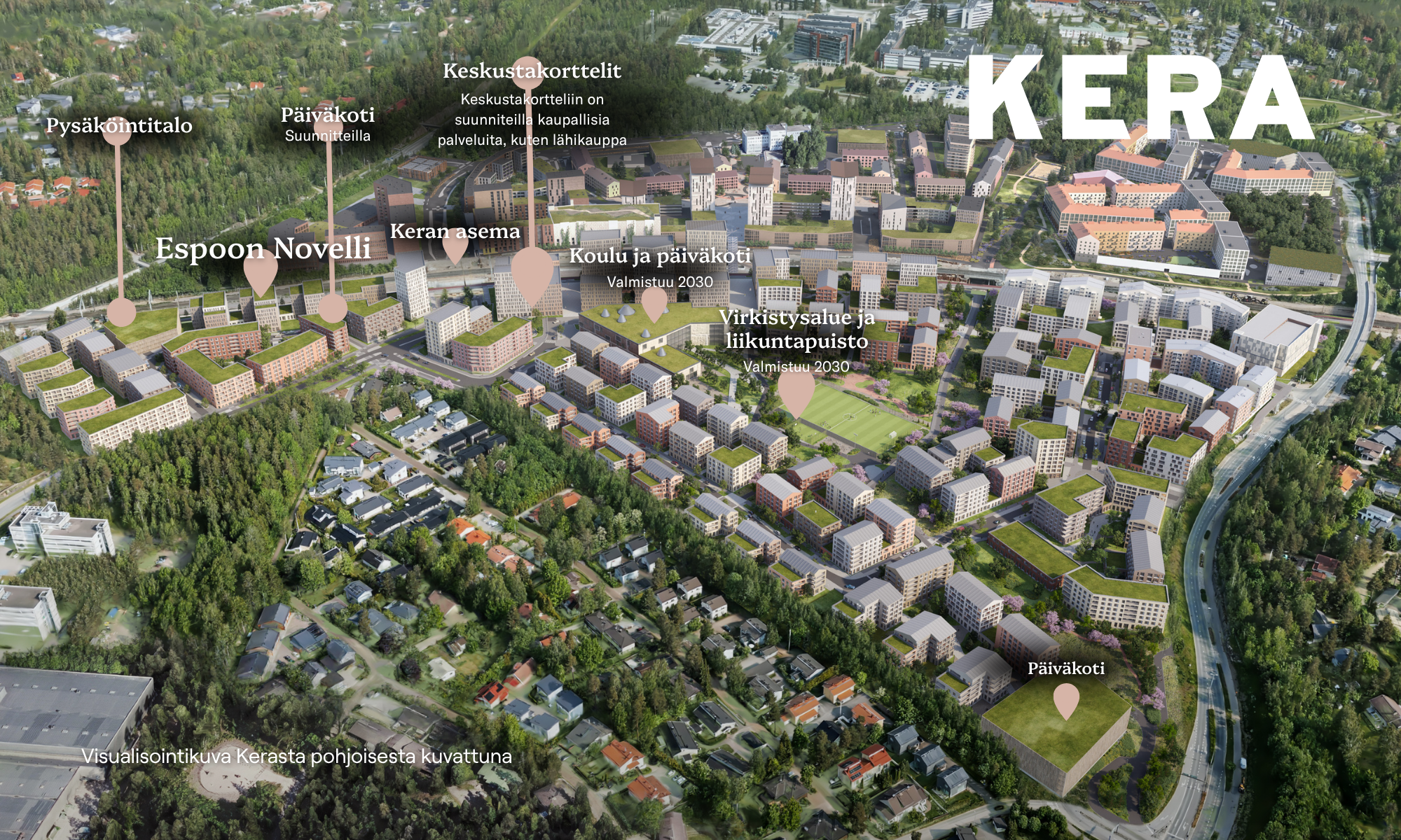 Entinen varastoalue antaa tilaa uudelle, huolella suunnitellulle kaupunkirakenteelle, jossa hyvät kulkuyhteydet, viheralueiden viehätys ja nykyaikainen kestävyyden ajattelu sulautuvat yhteen. Uuteen Keraan syntyy koteja noin 16 000 asukkaalle ja työpaikkoja noin 10 000. Kerasta muodostuu itsenäinen, monipuolinen kaupunginosa.