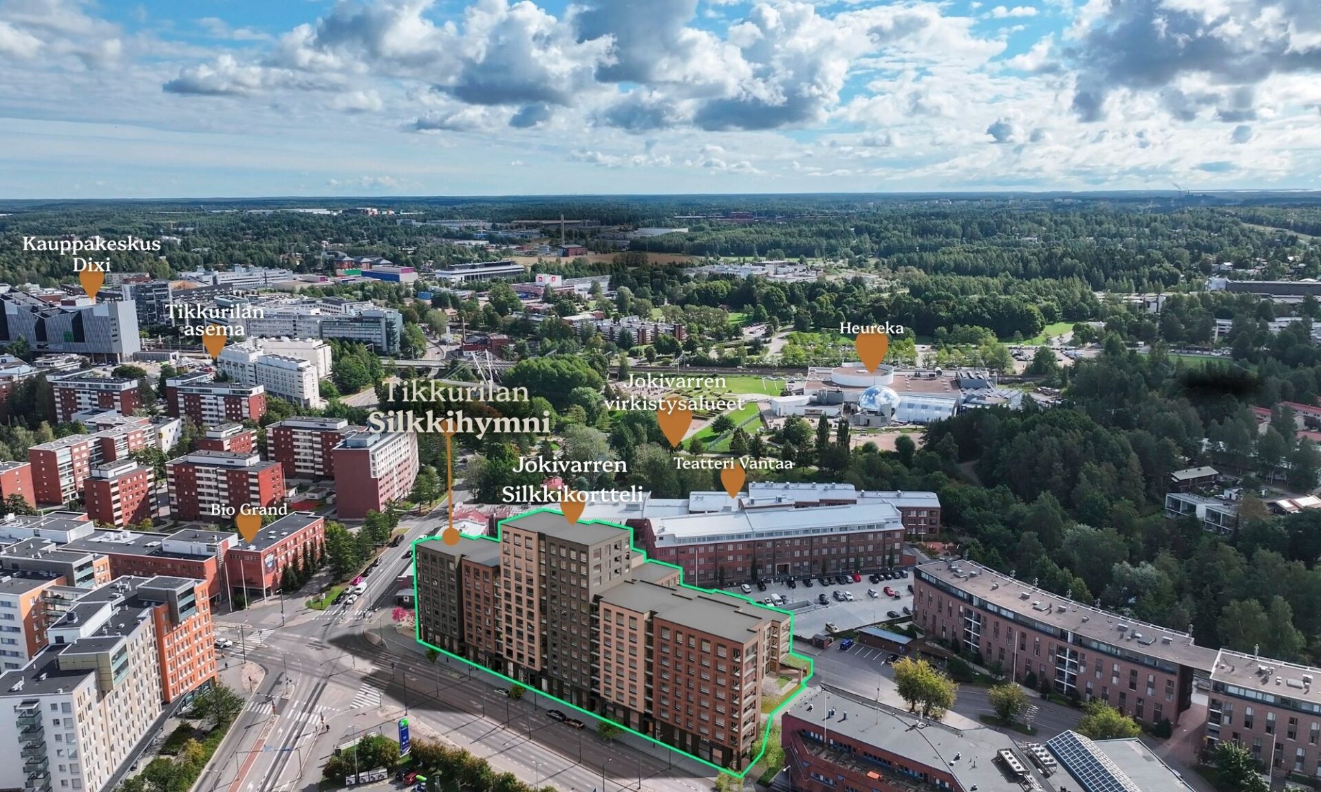 Tulevan korttelin sijainti Tikkurilan Silkkitehtaan ja Keravanjoen välittömässä läheisyydessä. Tiedekeskus Heureka kuvassa oikealla.